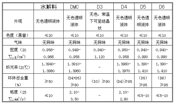 (一)二甲基二氯硅烷水解物(简称水解物或水解料),其是一种以二甲基二氯硅烷为主要原料,经过水解合成工序制得的或者在此基础上再经过分离、裂解、精馏后制得的一种以六甲基环三硅氧烷(D3)、八甲基环四硅氧烷(D4)、十甲基环五硅氧烷(D5)和十二甲基环六硅氧烷(D6)为主的混合物,其中六甲基环三硅氧烷(D3)及或八甲基环四硅氧烷(D4)及或十甲基环五硅氧烷(D5)及或十二甲基环六硅氧烷(D6)的含量达到50%以上。