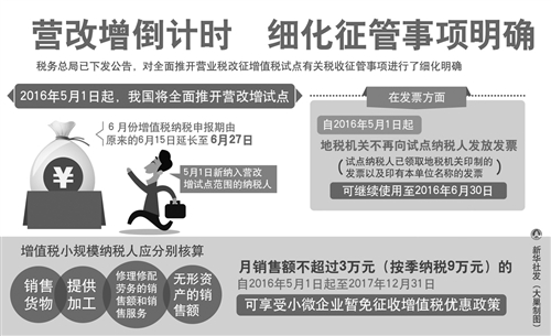 2016年5月1日起,我国将全面推开营改增试点,目前相关准备已进入最后倒计时。国家税务总局4月20日举行新闻通报会表示,下一步应将落实《深化国税、地税征管体制改革方案》与全面推开营改增试点结合起来,确保全面推开营改增试点实施到位