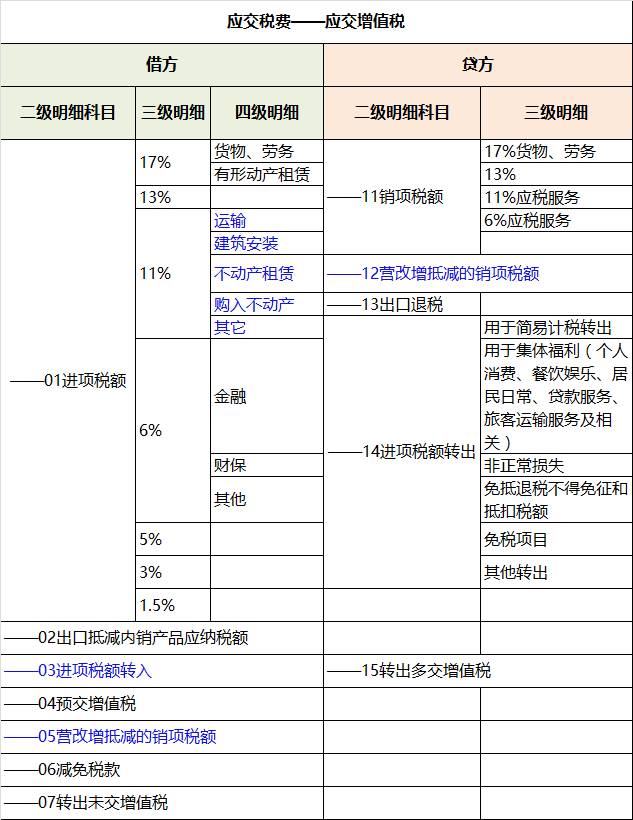 二、三、四级明细如下表(建立四级明细的目的,是为了满足《进项税额结构明细表》填报要求等)。另外,还可以根据不同的事业部、工程项目(含购销不动产、在建工程项目)建立项目辅助核算,满足不同项目增值税分别预征的要求。