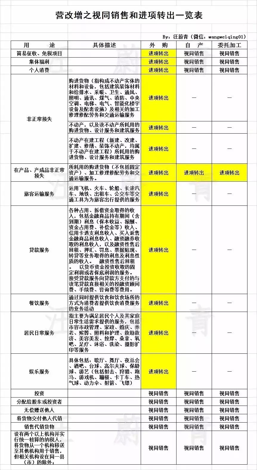 那么,贷款服务、娱乐服务、餐饮服务、投资、居民日常服务等又有哪些情形视同销售增值税需要进项转出的呢?对此,作者做了详细归纳,详情见下表:
