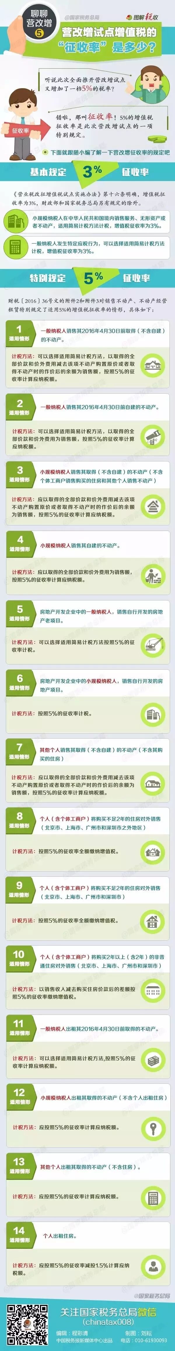 上周三与大家一起分享了《营改增后增值税税率分几档、税率、税目表》,有网友提出:不是还有一档5%的税率吗?这个叫征收率!5%的增值税征收率是此次营改增试点的一项特别规定。戳图了解营改增征收率的相关规定↓↓↓