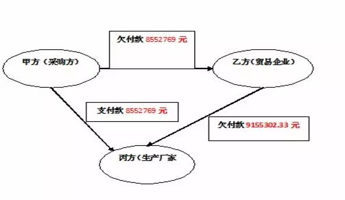 甲公司从乙公司购进钢材,取得乙公司开具的增值税专用发票174份,发票注明价款15208984.80元,税额2585527.42元,价税合计17794512.22元,甲公司据此申报抵扣了增值税进项税。甲公司从乙公司购进的货物(钢材),主要是乙公司从丙公司购进的。甲公司欠乙公司货款8552769元,乙公司欠丙公司货款9155302.33元。甲公司直接支付给丙公司8552769元,具体如下图所示: